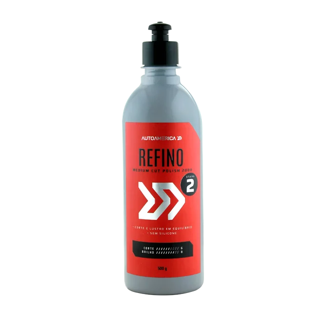 Parte da linha econômica Autoamerica, REFINO é o produto Menzerna Medium Cut Polish 2000, envasado no Brasil pela Autoamerica.